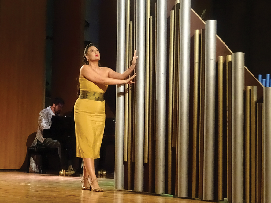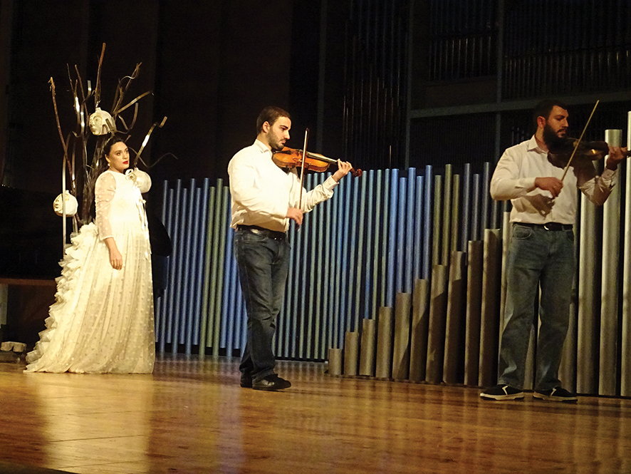 The venue, the Tbilisi State Conservatoire, played a decisive role in the scenography. Rather than neutralizing the space, I worked in dialogue with it. Wood, metal, and organ pipes became part of the visual language.