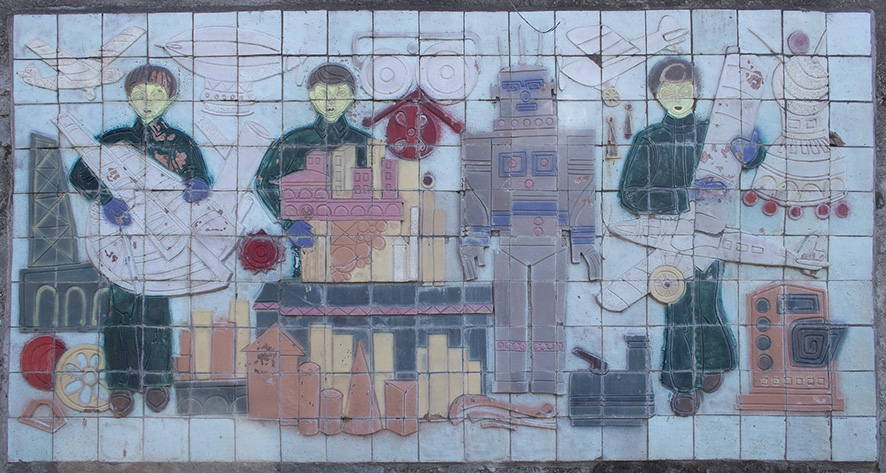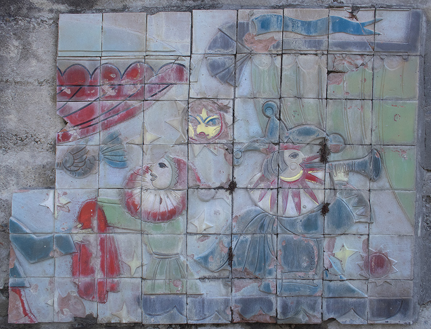Friends told me that on the road to Tianeti, north of Tbilisi, in the mountains, there are stands of birches visible. So I set off to try to find them. On the way, I first stopped at a whole series of Soviet-era ceramic tile murals set onto concrete walls at the roadside. These are crumbling but still beautiful, in a naive folk-art way, and I carefully photographed each one before they fall to ruin. Then I drove on.