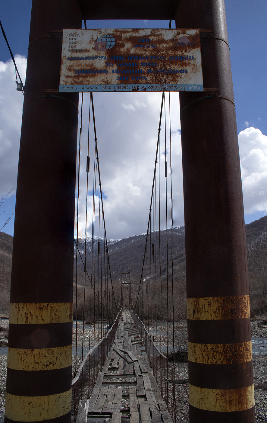 Indeed, my Tianeti birch search did leave me in the lurch. I drove on the nicely asphalted road right to that town, through it, and farther north, through villages with names amusing to me. Churchkhelaurebi, for example. You could translate this as the place where people (-eb) who make churchkhela, the Georgian national sweet of walnuts in thickened grape syrup, live (the -ur signifies that they are also Khevsur people). Khevsurtsopeli, similarly, means “Khevsur village.” And many other village names on signs which I have never come across before. Lisho, Bodakheva, with its nice crumbling old bridge which I dared to walk on. Ghulelebi, Devenaantkhevi, Velebi (which means “Valleys”), Aloti, Bokoni, Mamadaanebi, and more.