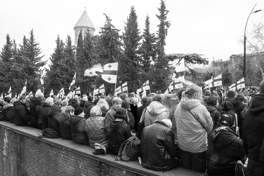 Crowds were gathering, as they would be everywhere, at the join of the road coming down from the cathedral and that going downhill to the bridge. Hundreds of uniformed policemen were already standing shoulder to shoulder on both edges of the cathedral road. At the junction, these were replaced by soldiers in uniform, with every 5th one or so holding a Georgian flag on a wooden pole.