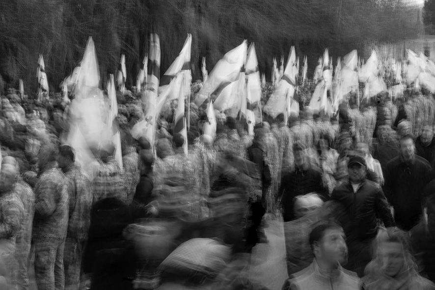 I admit to thinking, seeing not only the sea of cellphones but many cameras like mine too: How can my photos stand out? And decided to adopt one of my favorite techniques, slow shutter speed for motion blur. Not, I add, simply to try to be different for its own sake. Actually, the flags’ motion in the wind, and the procession’s movement contrasted with the stillness of the soldiers, gave me what I wanted to evoke. Then I processed everything in black and white at home.