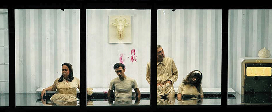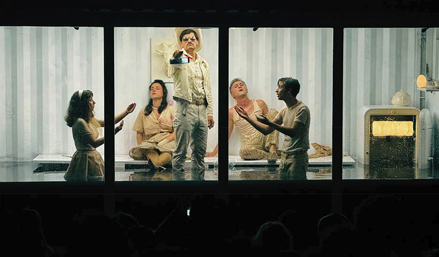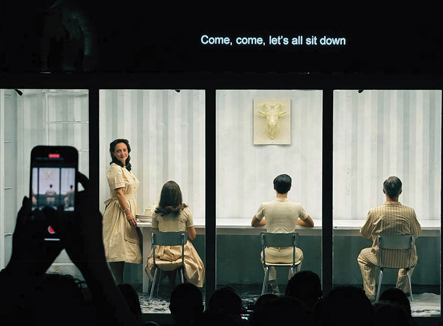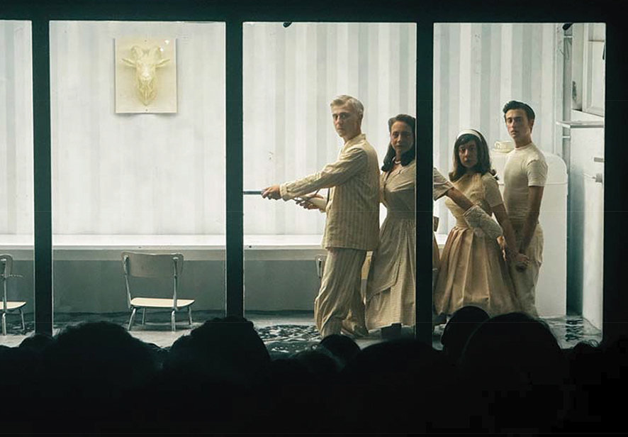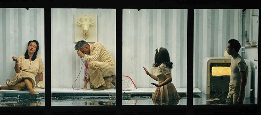 This mediation is not a gimmick—it is the play’s central metaphor. The family is trapped in denial, endlessly insisting that “nothing has happened” despite evidence to the contrary. The audience, meanwhile, is forced into a parallel condition: to witness but never touch, to hear but never speak back. It is theater as surveillance, as voyeurism, as forced distance. The actors, for their part, play inside the box like animals in a terrarium. Their gestures become heightened, stylized by the container’s claustrophobic frame. They are both protected and endangered, immaculate and drowning.