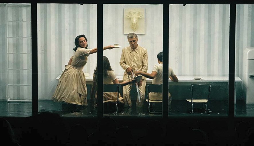 Drowning becomes literal. As the play advances, muddy water begins to seep into the pristine space. First a trickle, then a flood. The family continues to deny, continues to cook, to set the table, to arrange their breakfast as if nothing were happening. But the water rises until their movements are slowed, distorted, their white clothes stained and heavy. The sterile idyll collapses into slosh and struggle. The metaphor needs no explanation: denial is not sustainable, cleanliness cannot last, the swamp rises everywhere. And yet the insistence on routine persists. The father still polishes an egg, the mother still tends to the cutlets. Survival, in this context, means performance of normality.