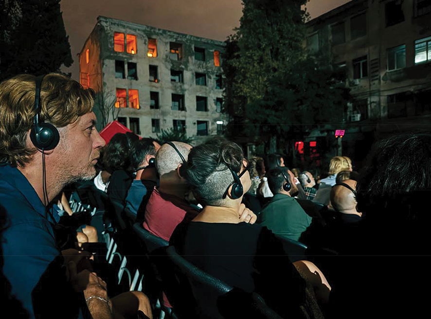 The play’s mechanics intensify this contradiction. The actors are sealed inside their immaculate box, as if inside an aquarium. They cannot project to the audience in the courtyard. There is no live voice. Instead, each spectator receives a pair of headphones. Through these, the dialogue is transmitted with studio clarity, while sub-bass vibrations ripple through the ground, puncturing the body from below. This sound design (a collaboration between composer Erekle Getsadze and the technical team) produces an uncanny duality: the intimacy of whispered speech in your ear, the violence of vibration in your chest. Theatrical presence is displaced into a mediated acoustic experience. You watch bodies behind glass, but you hear them inside your skull.