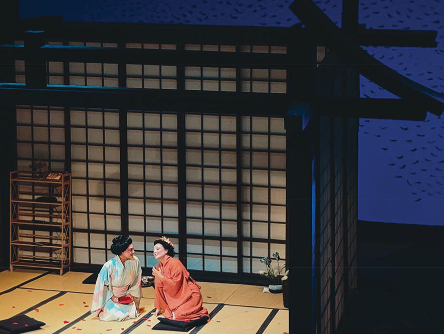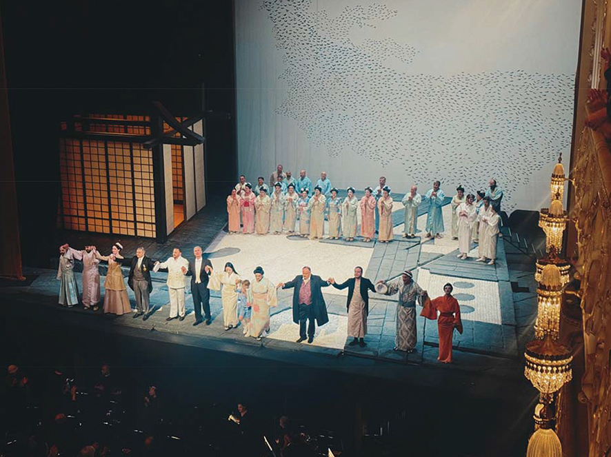 Asari’s staging, designed originally for La Scala and revived with precision by the Georgian company, presents a visual economy that mirrors Puccini’s musical transparency. The set, minimalist yet luminous, floats between realism and abstraction: paper walls, open frames, and light so soft it seems to breathe. Lighting designer Stefano Gorreri and costume designer Hanae Mori constructed a world of filtered textures — silk and shoji screens, bodies half-visible in shadow. The aesthetic is not orientalist excess but restraint; it renders the familiar story uncanny, as if viewed through memory rather than history.