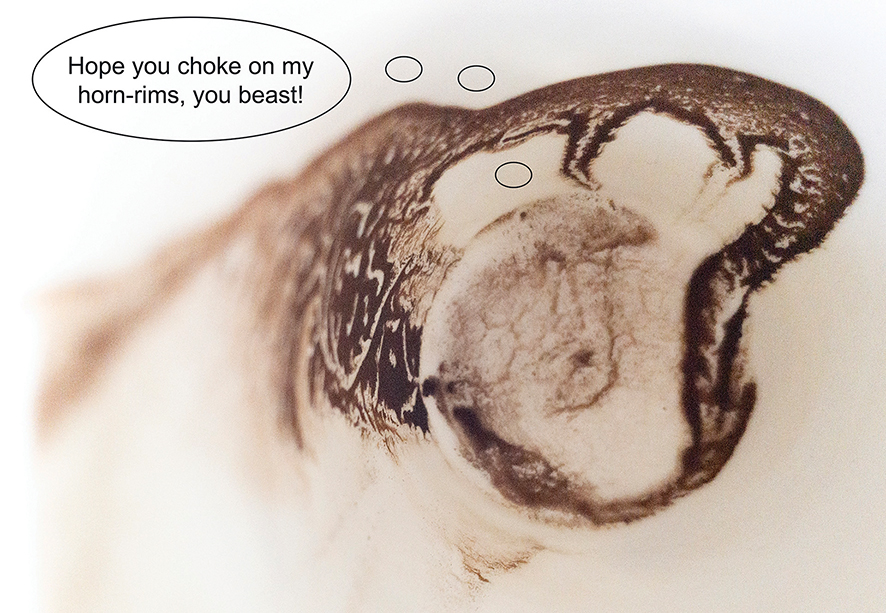 Pareidolia, which lets one see concrete images in random places like clouds and wood knots, is another powerful force in my life, and it is this which has led me down all sorts of rabbit holes of delight. Svaneti’s OTHER life forms, made of rock, shadows, clouds, snow and ice, have revealed themselves to me and demanded that their stories be told (serialized in this very newspaper!). And, yes, things jump out at me from the bottom of my thrice-daily coffee mug, on a regular basis, and I photograph them. So perhaps the overwhelmingly unlikely was just a matter of time. That time has come, at least once.