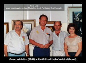 Figure 4: Group Exhibition (1984) at the Cultural Hall of Ashdod (Israel). From left: Mayor of Ashdod Aryeh Azulai, Israel’s Minister of Health Motta Gur, Artist Jacob Pichhadze, Artist’s wife Zinaida Pichhadze.