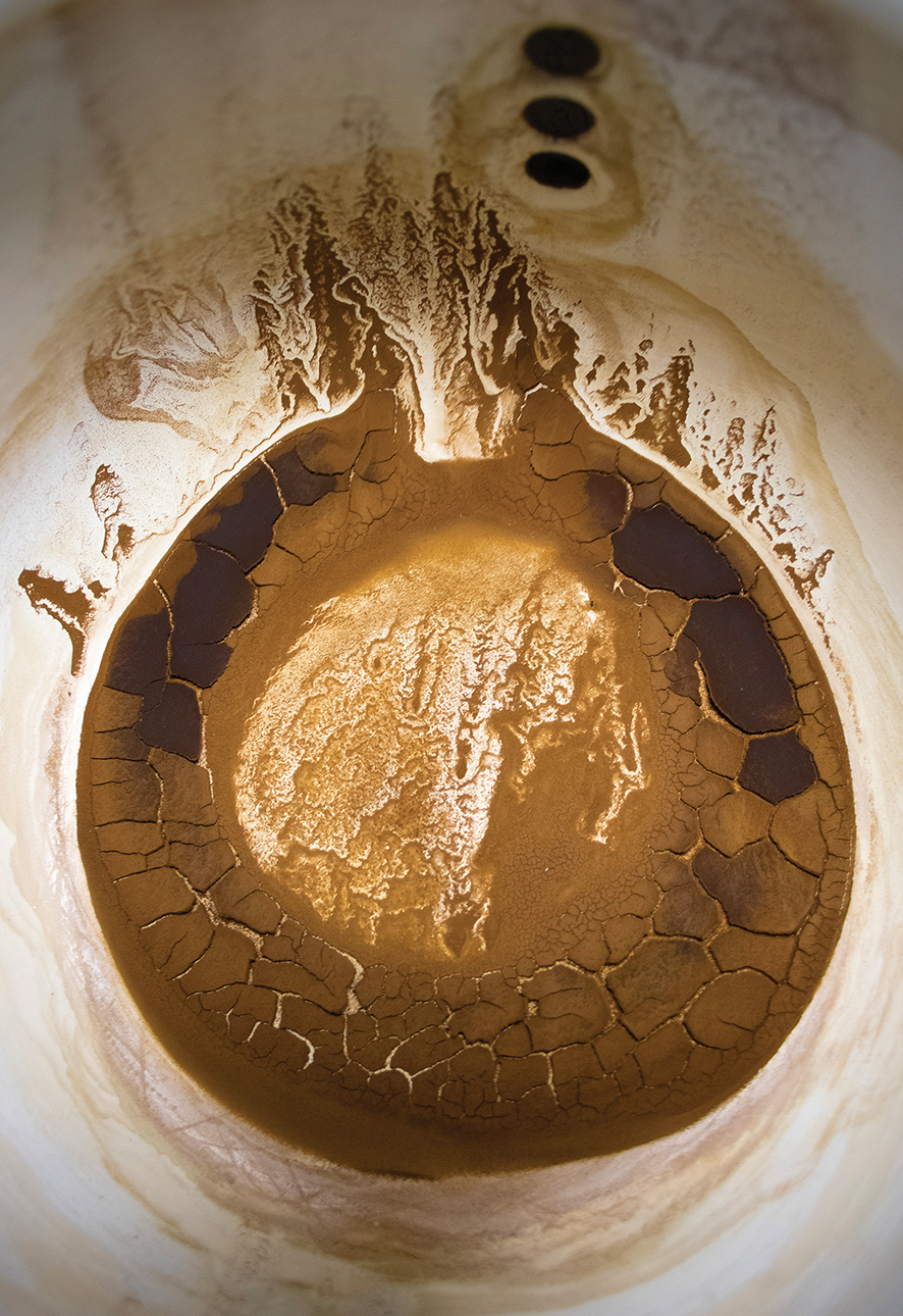 A couple of these are my favorites. A horn-rim-bespectacled lady straight out of the Far Side comics, calmly being swallowed by a Lovecraftian slug-monster, stands out, because what are the odds of ever finding such a scene in coffee grounds? It’ll never happen again. The same for a much larger piece, which rates a triptych of zooming-in shots. This, leftover grounds from a cold coffee brewing in an enamel teapot, is called “The Tyrant Dreams of Mushroom Clouds”. A disturbing image, not necessarily a pleasing one, but powerful. I chose to spray-varnish both of these pieces, to preserve them forever. What, I can’t buy my wife a new teapot to replace that one?