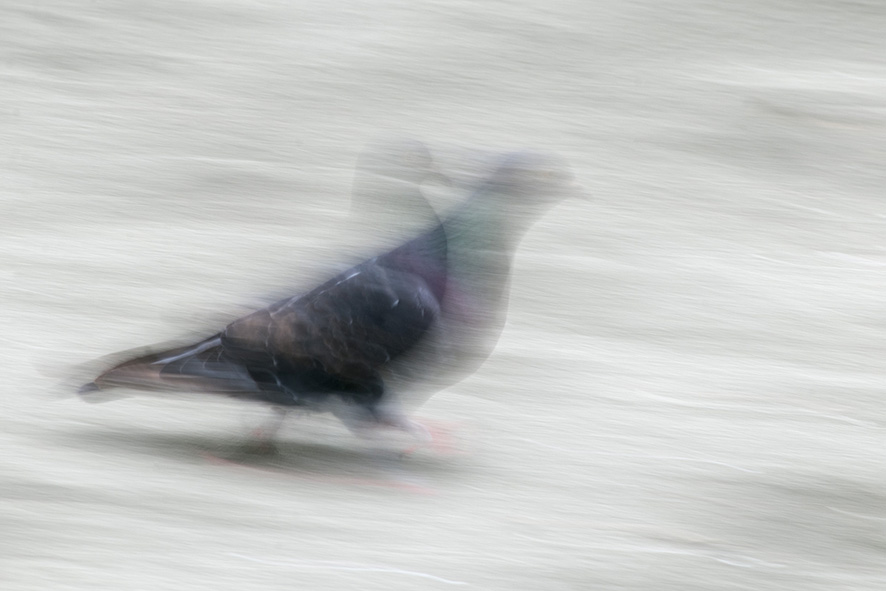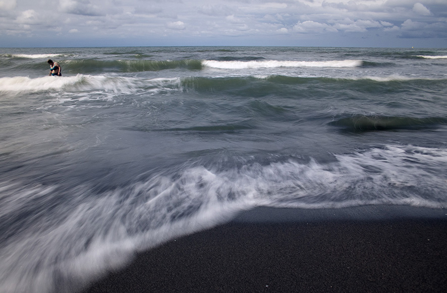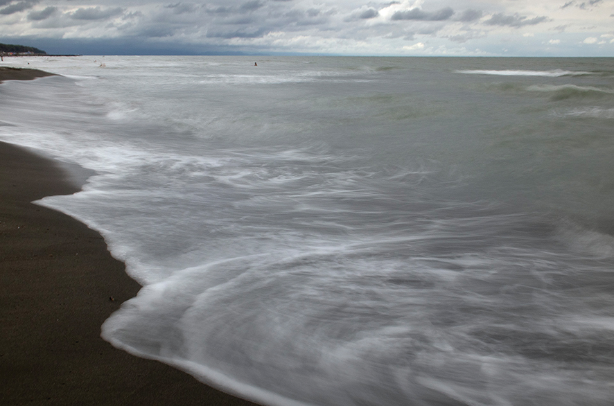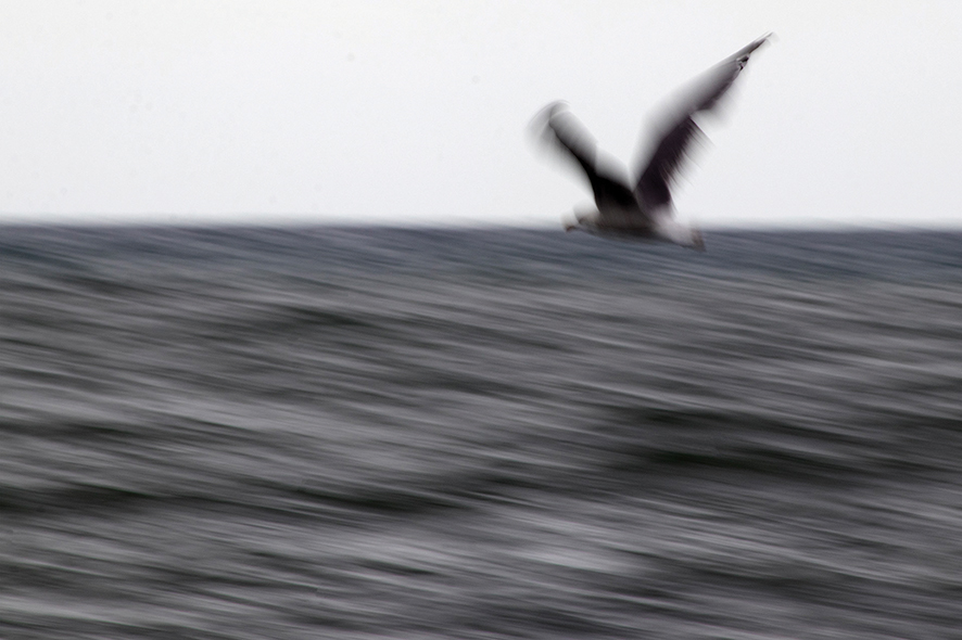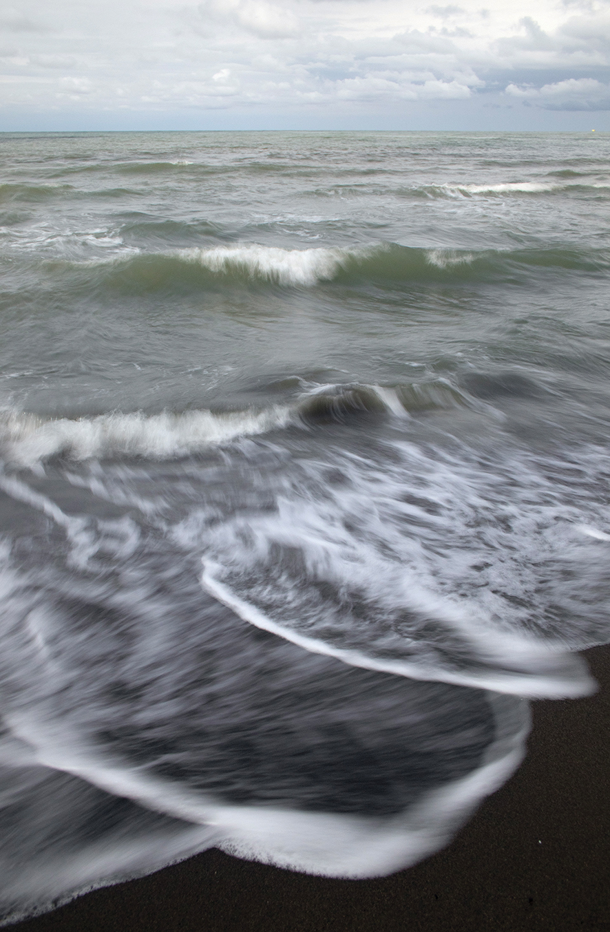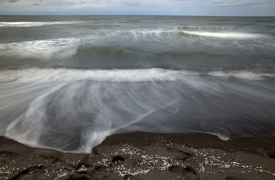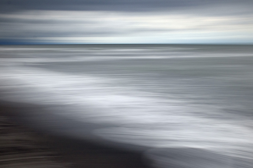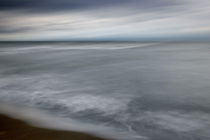 I could hardly see anything through the darkened viewfinder, but just enough to see by. I even tried moving the camera parallel to the flat coastal horizon for a few shots, instead of keeping it still, to blur the rolling waves and more static sky as much as possible and end up with the dreamy, surrealistic frames I was after. Thanks to a large memory card, I could shoot hundreds of frames quickly, and did so, missing my years of 35mm film rolls of 36 exposures not at all. That evening, uploading everything to my laptop, I was able to see how things had gone, and ended up with plenty of very satisfying images. This time I kept them in the muted colors in which I had shot them, instead of reducing them further to monochrome. In nearly every case, the slightly crooked and barrel-distorted horizon needed straightening, along with a slight color and contrast improvement; but nothing more.